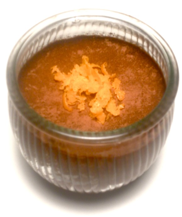 3. Once the orange peel has steeped in the cream for about an hour, re-heat the cream again to a gentle simmer, and pour the hot cream through a strainer into the bowl with the chocolate. Using a ladle, make sure all the chocolate is covered by the cream.