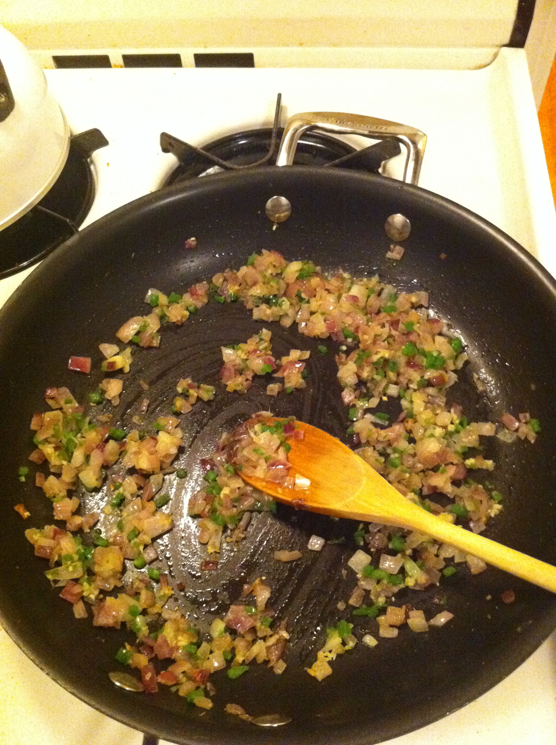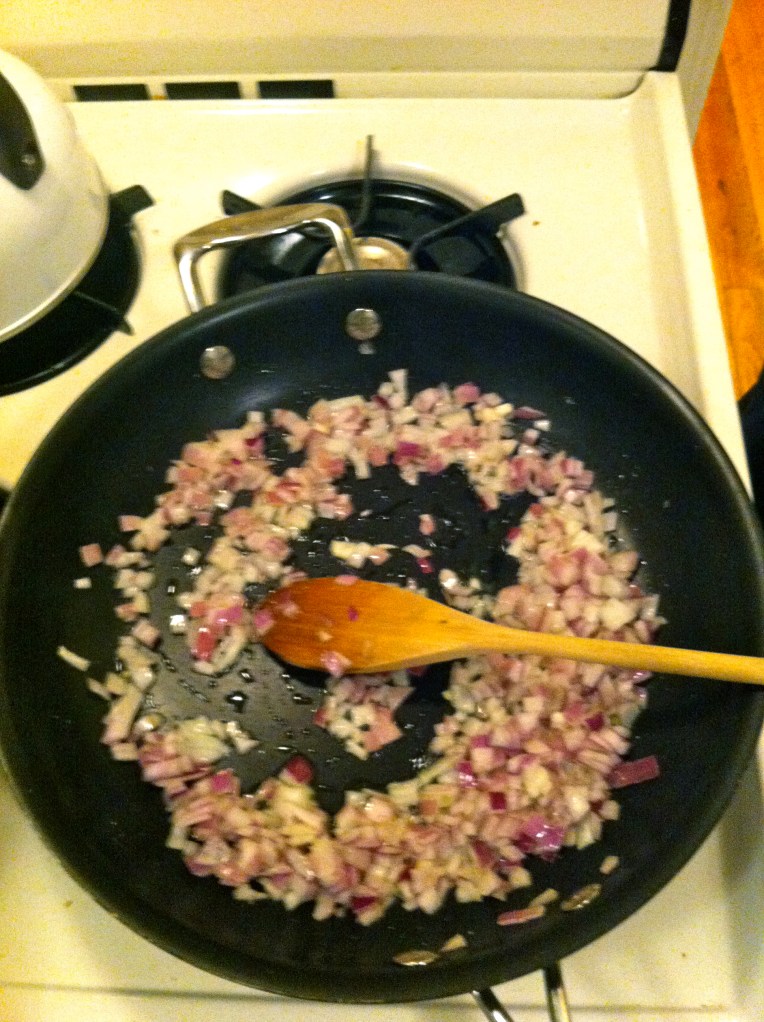 When the oil is all heated up, add the diced onions and cook until slightly browned.