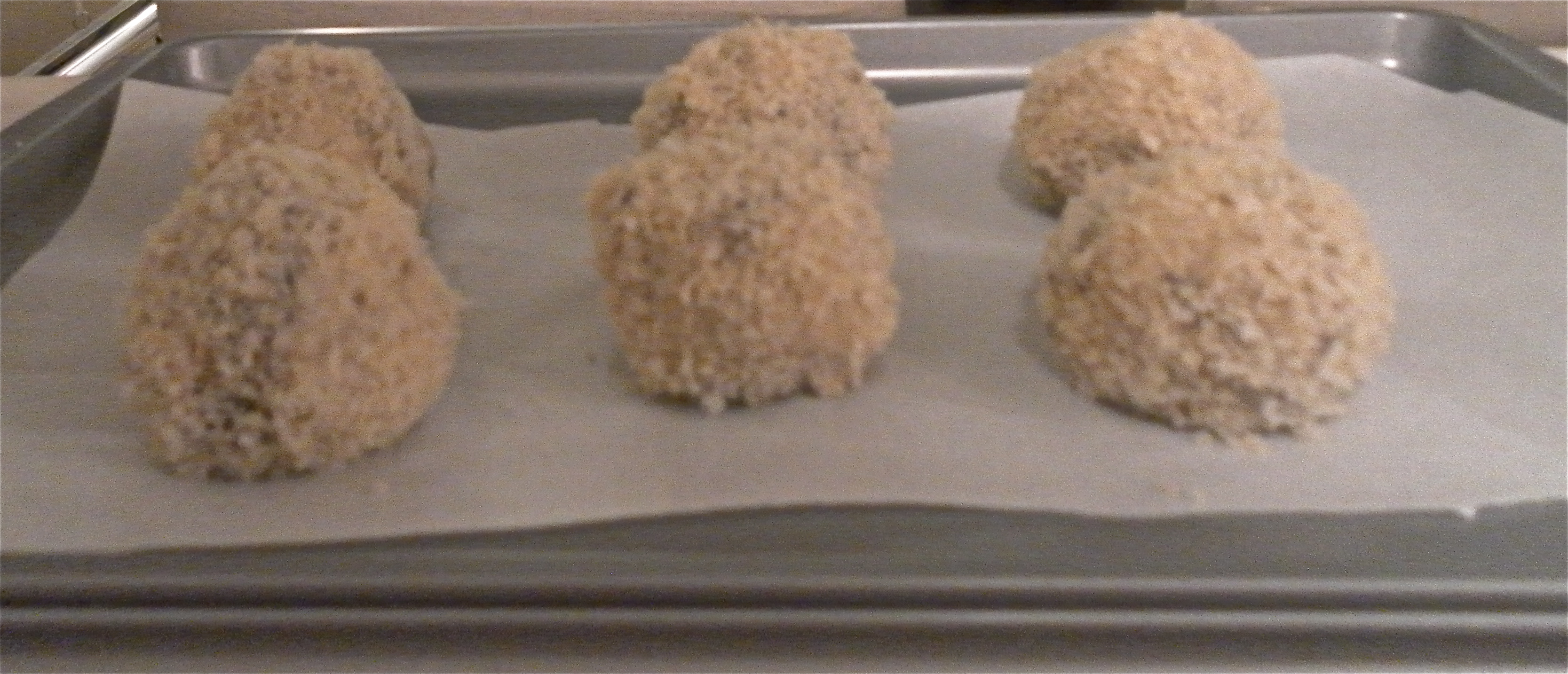 Next, dip each flour-coated ball into the egg white, immediately roll it in the panko crust, and then place it on the baking tray.