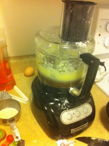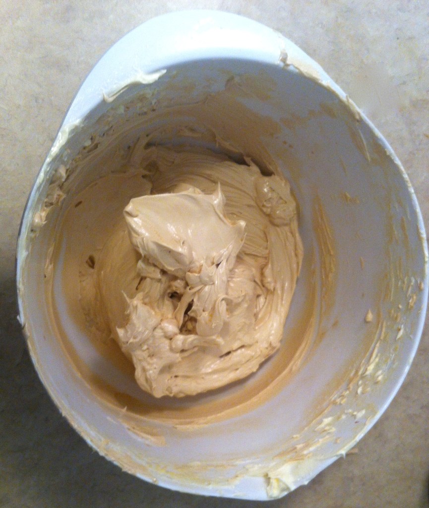 I began by putting about 3/4 cup of icing sugar into my food processor. I then processed it to get rid of any lumps. Next, I added the butter to this and processed it again, until it was a smooth, creamy mix. If you don’t have a processor just put the sugar and butter in a large bowl and use an egg-beater ( or whisk).