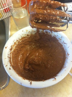 There is a reason these measurements are so imprecise. I just sort of experimented. They say that cooking is an art-form because you can adjust ingredients and spices to taste, whereas baking is science. This is generally true I think, but frosting is a little more on the art side of the scale than baking a cake is. What I mean is you can have an adjustable frosting recipe. I find most frosting to be too sweet and creamy- I would prefer it to be more buttery and chocolately. I also like to put a lot of frosting on my cake 🙂 This is why I have listed approximate measures here.