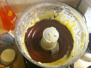 The next step was to add the chocolate. I spooned about 3/4 of the chocolate into the processor and processed it.