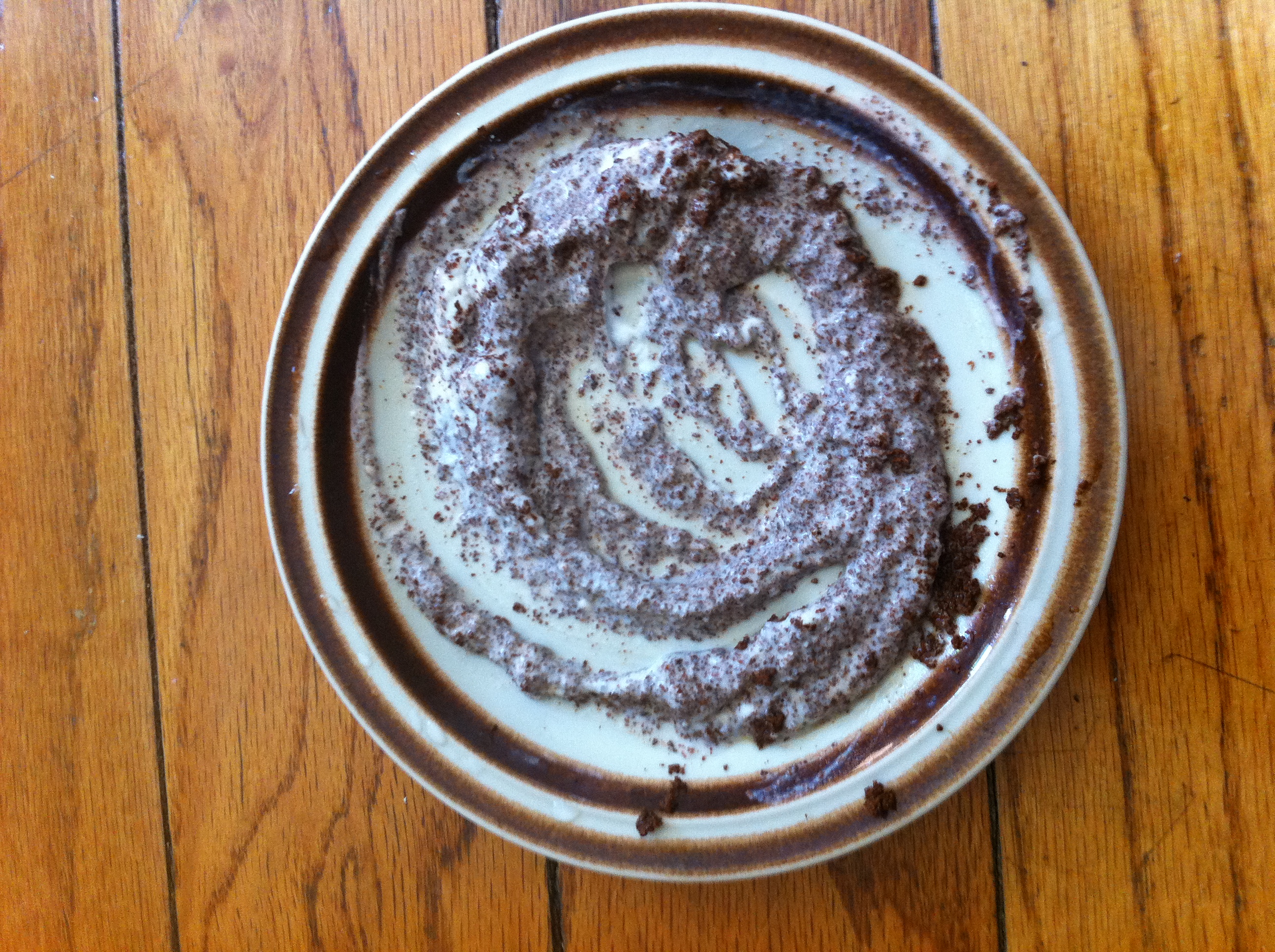 While the chocolate was melting I began whipping the cream cheese up with the mixer (egg-beater). When it was creamy and softened, I added 2 tablespoons of icing sugar and whipped this into the cheese. I tasted the mixture and thought it needed a little more sugar, so I added another 2 tablespoons. (You should also taste the mixture intermittently and see if it needs more sugar; add as much as you think is appropriate.) Once it tasted just right, I scooped out about a third of the mixture into another bowl and place this bowl in the fridge.