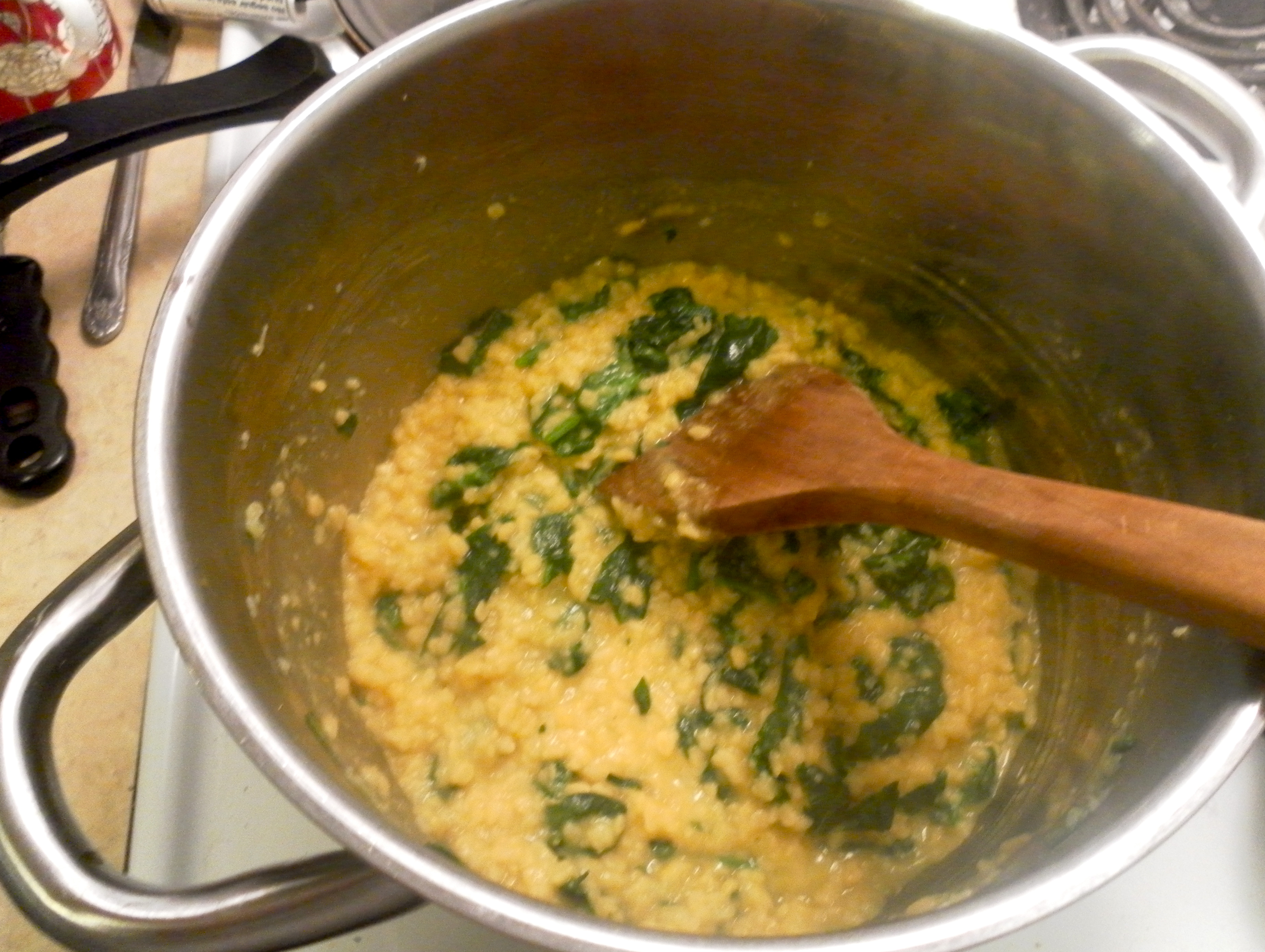 Heat a tablespoon or two of ghee in a little saucepan on high heat. Let the ghee get hot. To test if it’s hot enough, throw a single cumin seed into the pan. If it begins to sizzle, add the mustard seeds and the rest of the cumin seeds and stir them about until they start to pop. When they start to pop, add the asafoetida and red chilies, followed by the curry leaves and garlic cloves about 30 seconds later. Once the red chillies darken, add the baghar to the lentils. Immediately cover the pot.